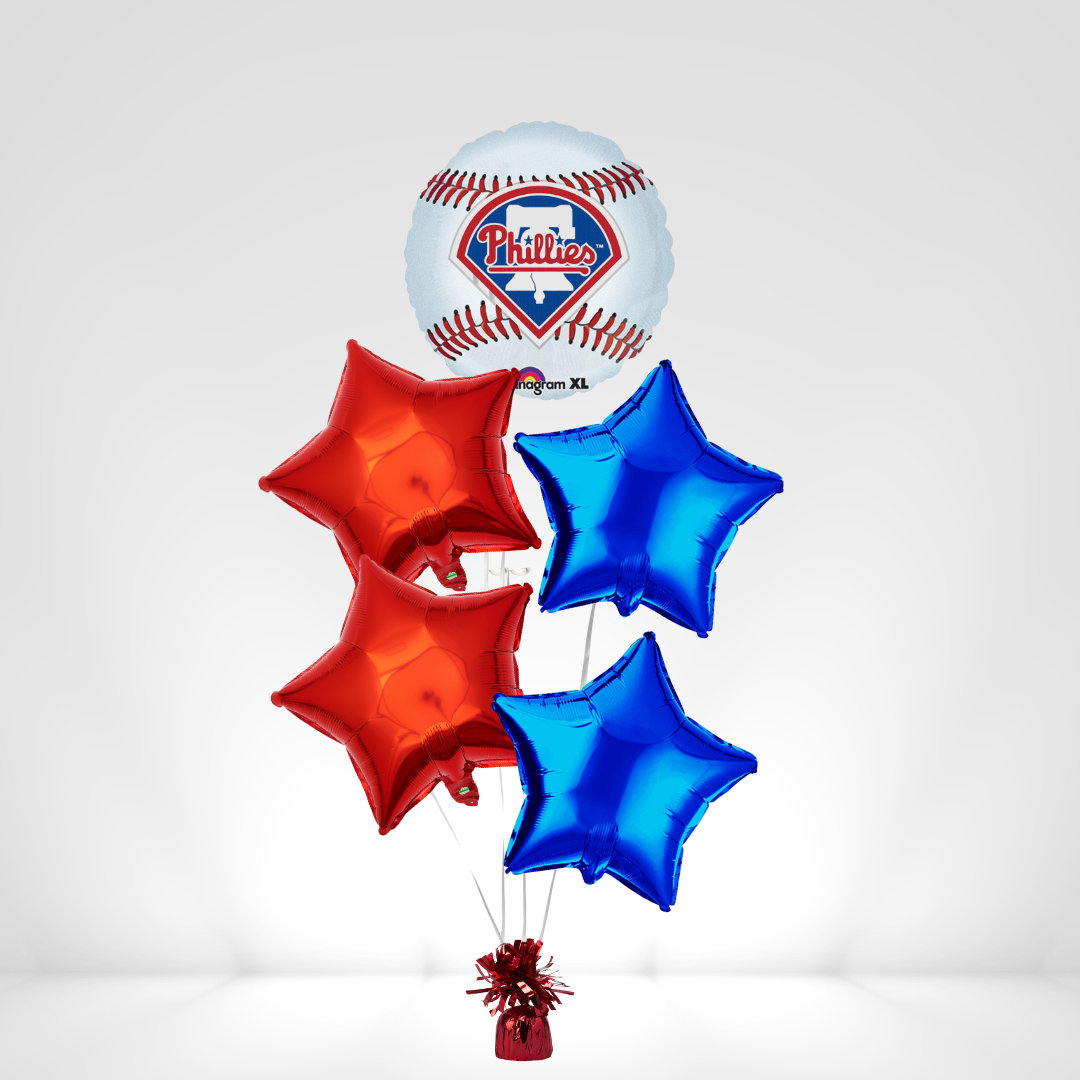 Hit a home run at your next celebration with this Philadelphia Phillies Balloon Bouquet! Featuring the classic Phillies baseball design and patriotic red and blue stars, this festive bouquet is perfect for game day parties, birthdays, or showing team spirit all season long.