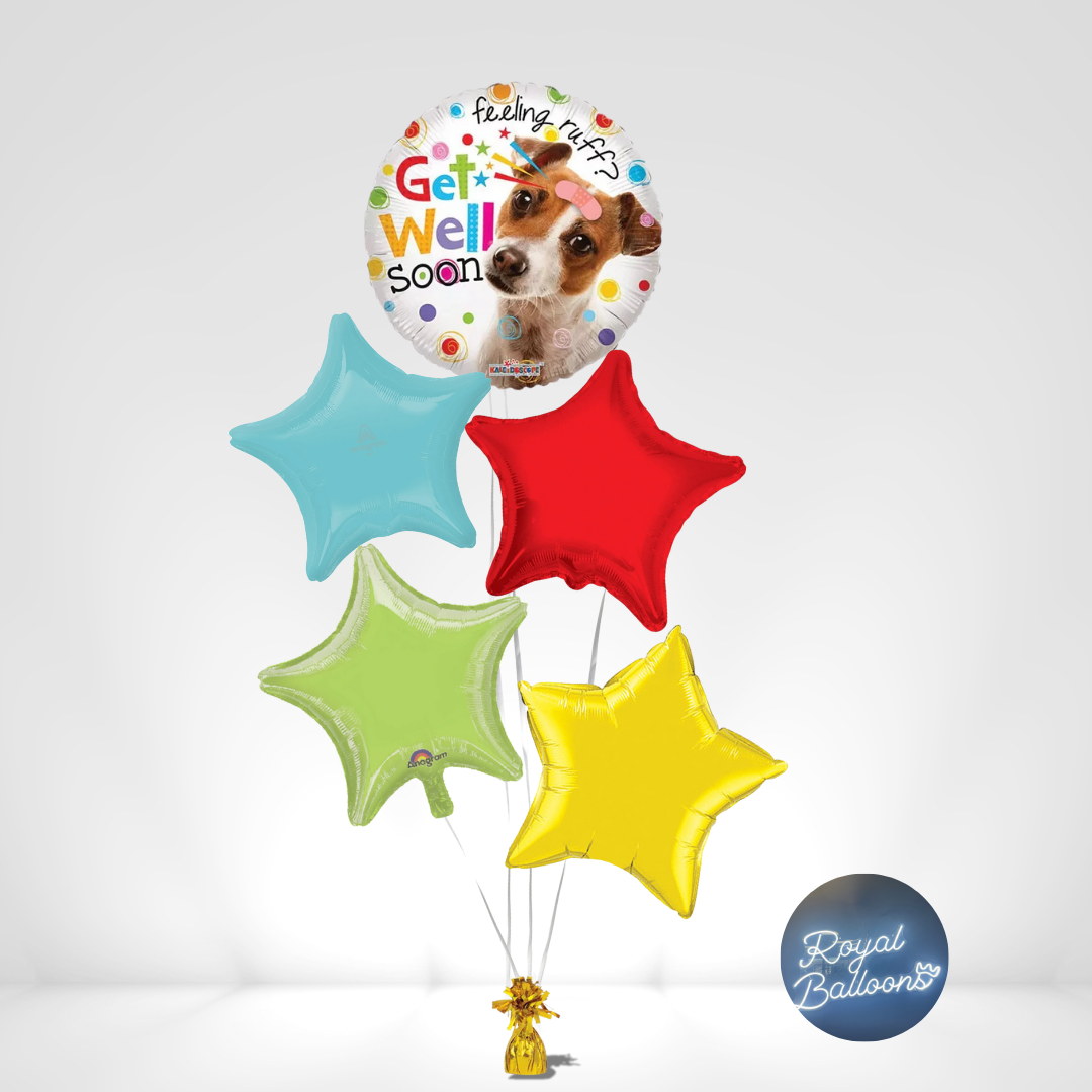 Feeling ruff? This cheerful Get Well Soon Balloon Bouquet featuring an adorable pup is just what the doctor ordered! Bright, colorful stars and a playful message make this the perfect pick-me-up for anyone on the mend.
